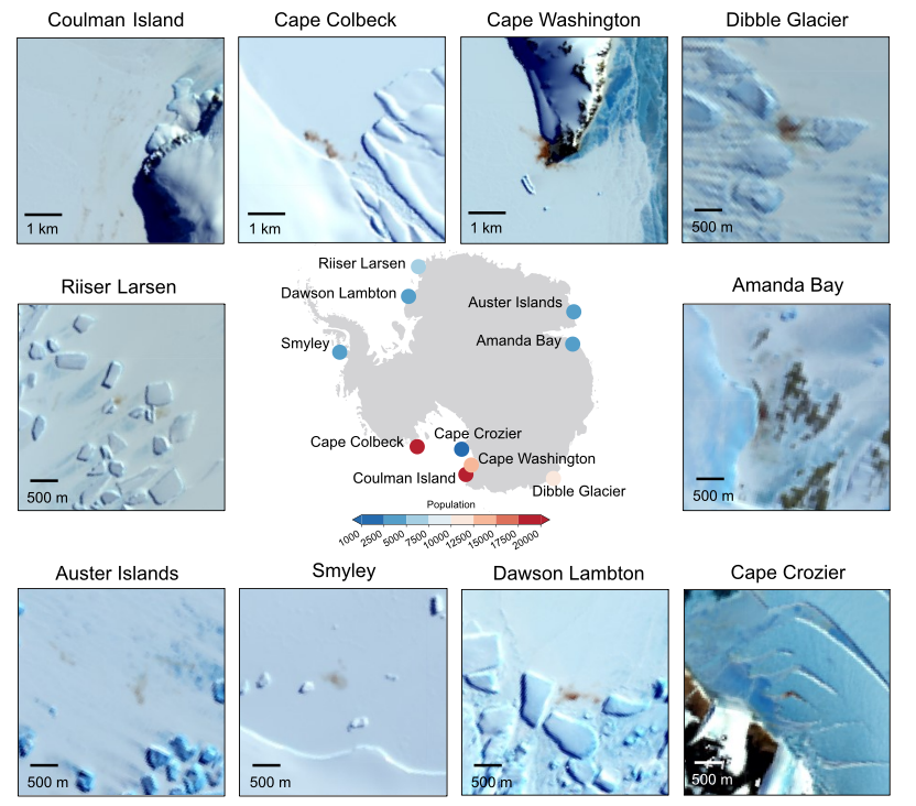 卫星遥感影像娇傲的10个伏击帝企鹅栖息地的散布。