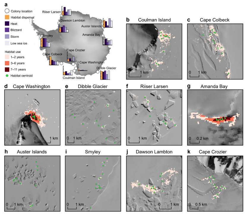 帝企鹅栖息地利用与顶点表象事件。a, 柱状图的定性比拟娇傲,暴露在更强顶点事件下的栖息地鄙俗具有更高的年际移动距离。b–k, 不同帝企鹅栖息地的占据时长娇傲出互异,占据时长更长的栖息地鄙俗具有愈加汇集的散布。