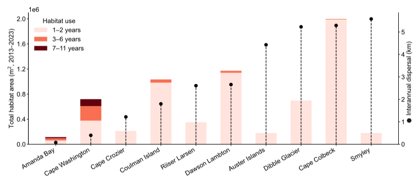 帝企鹅栖息地占据时长与年际迁移距离的比拟。柱状图款式示意栖息地占据的时长,其大小示意栖息地占据的面积。斑点与虚线示意栖息地的年际迁移距离。举例此迈利岛栖息地的迁移水平更高,其栖息地重迭利用性也更低。