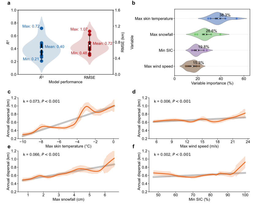 他进一步量化了这种变化:温度每升高1℃,帝企鹅栖息地平均迁移距离增多73米;降雪每增多1厘米,迁移增多66米;风暴和低海冰密集度对栖息地迁移的影响则呈现非单调性。
