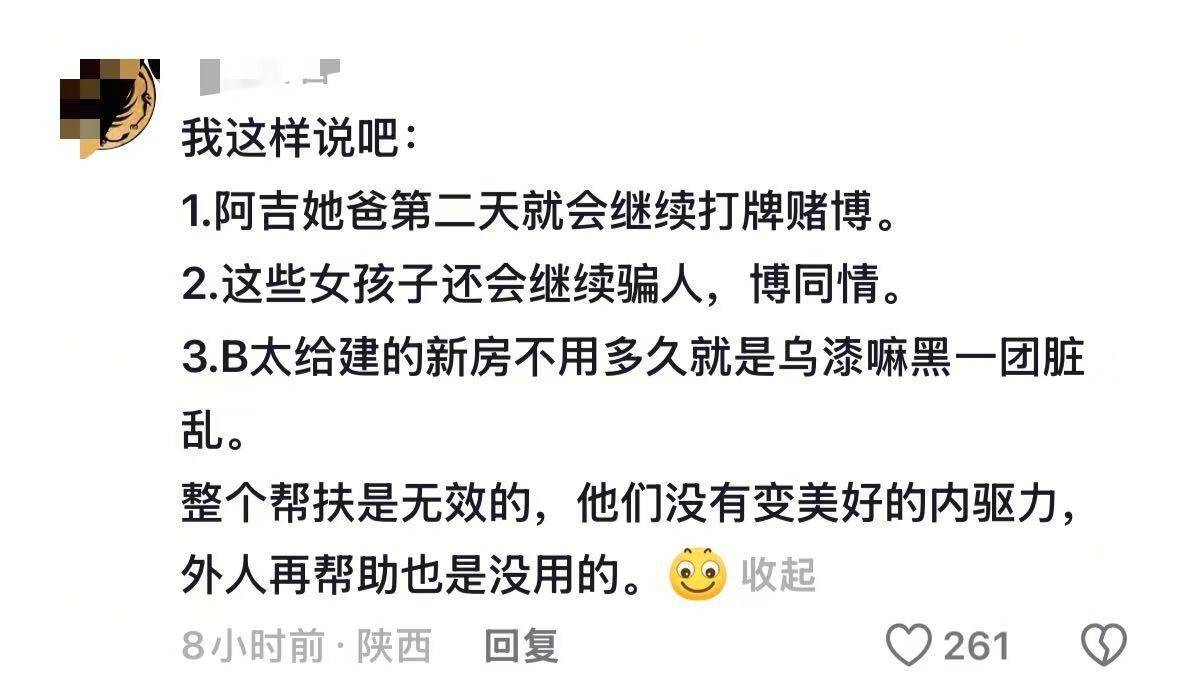 更扎心的是,网友扒出来,阿吉那间用来拍视频的破屋,傍边早就有政府给建的新址,干净整洁,步伐皆全,东谈主家宽广根柢不住那破屋子里,那破屋等于个专门用来摆拍的“谈具房”。