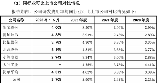 而凭证原A股递表时的2020年-2022年及2023年上半年,香江电器研发用度率显着弱于同业业可比上市公司平均值。